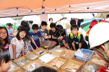 写真は平成27年、大園遺跡の出土品を見学する地域の小学生の様子です。