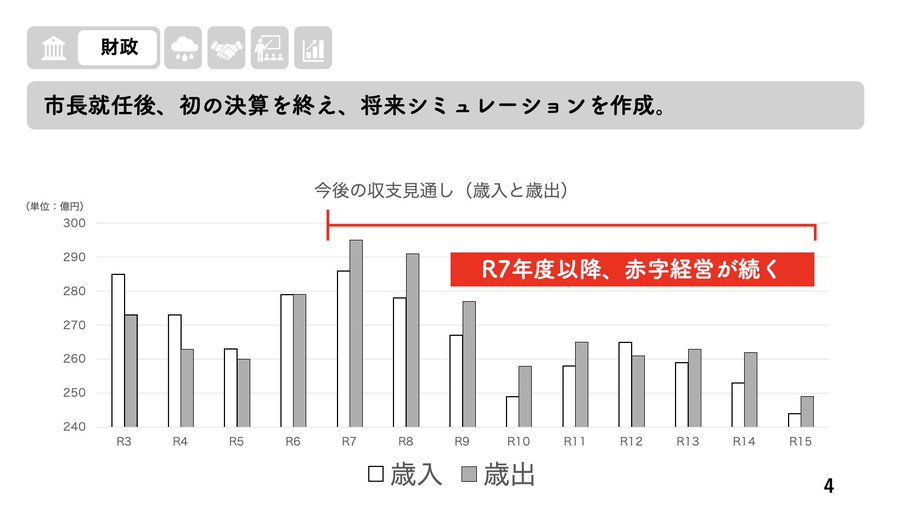 市長就任後、財政シミュレーションを立てたところ、R7年度以降に赤字が続き、